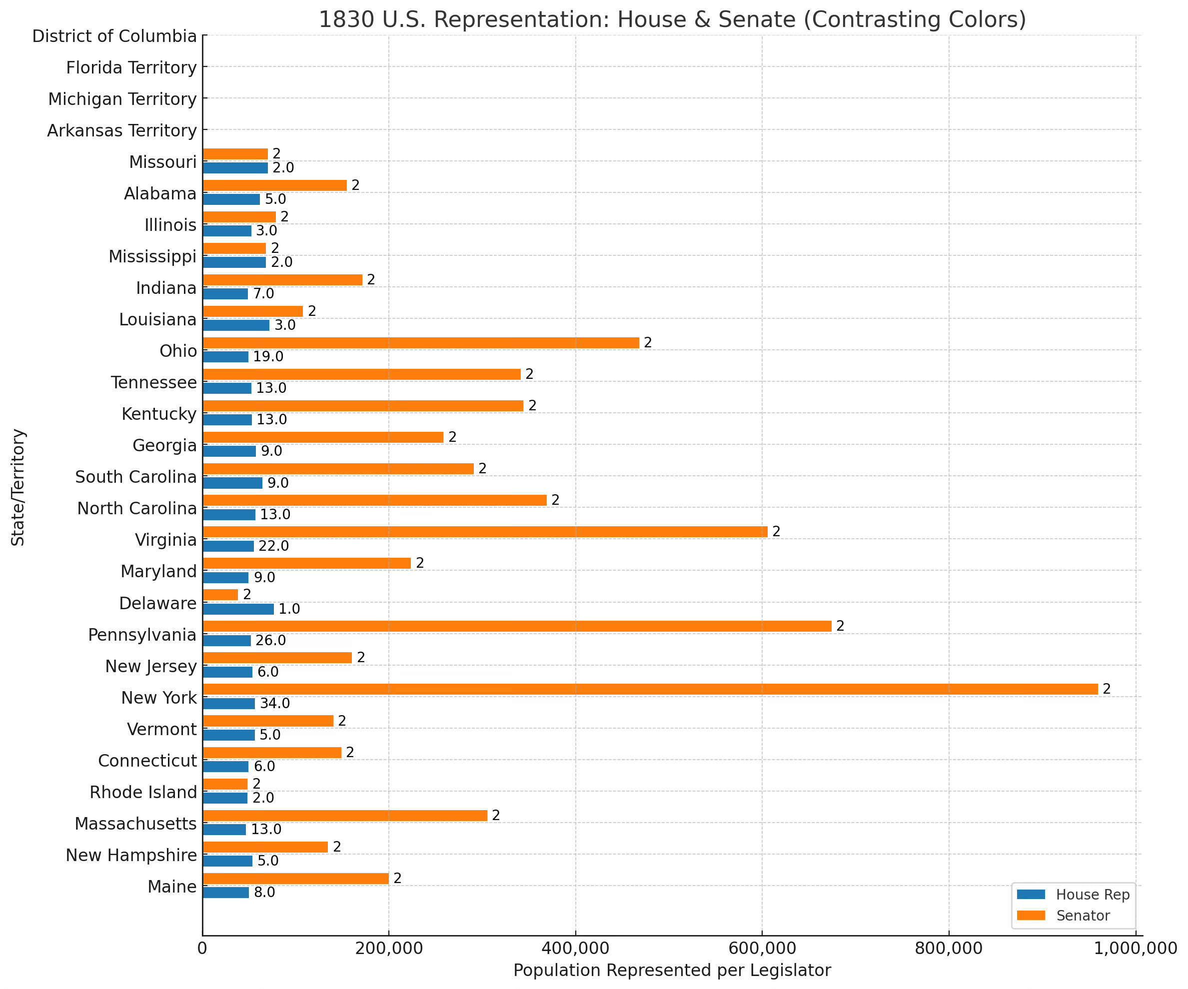Meanwhile, the Senate’s structure created even greater disparities as each state — regardless of population — had two Senators, meaning that in New York (population approx. 1.92 million), two people represented nearly a million residents each, while in Delaware (population approx. 76,748), two Senators represented fewer people than a single House Representative from a larger state.